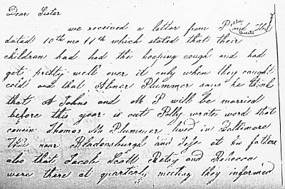 We received a letter from Polly and Hannah Griest dated 10th mo 11th which stated that their children had had the hooping cough and had got pretty well over it only when they caught cold and that Abner Plummer says he think that A Johns and M P will be married before the year is out Polly wrote word that cousin Thomas M Plummer lived in Baltimore Will near Bladensburg and Jess at his fathers also that Jacob Scott Patsy and Rebecca were there at quarterly meeting they informed that Betsy Steer formerly Pancoast was dead she died in the second month P says she would have written to thee long ago if she had known where to direct a letter to I have had the chills and fever this fall I had it the most of the time for nearly two months I have not been cofined to the bed much of the time Maria Wm Thos are gone to S Grissells E Lupton and Grissells young folks have been to see us lately there is talk of Amos Grisselle and E Lupton getting married ??