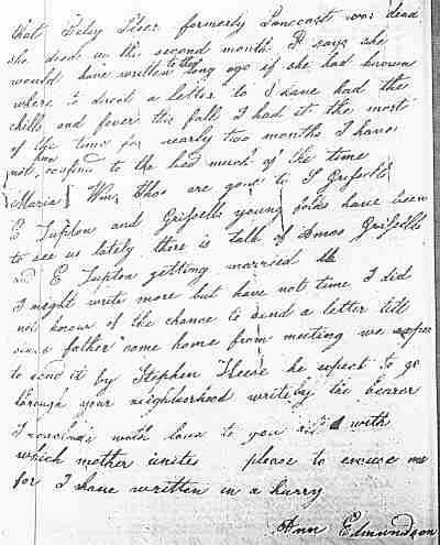 Note: This letter is typical of the writing style of that period. Punctuation, capitalization, and spelling were far from standardized. The fact that she could read and write, and that she had a good vocabulary, indicate that she was an educated woman.