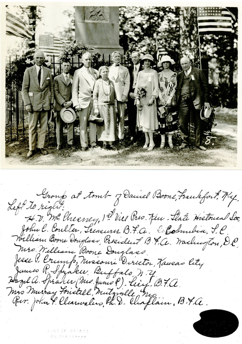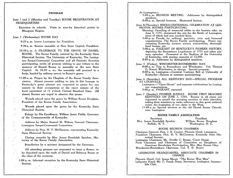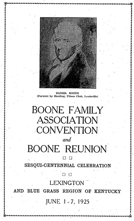 The Boone Family Association held its first reunion in Kentucky on June 1-7, 1925. It was their plan to hold reunions every five years. This first one was intended to honor Daniel Boone and to commemorate the events of his life and his contributions to Kentucky. There were events and programs in Lexington, Frankfort, Boonesboro, Winchester, and Louisville.