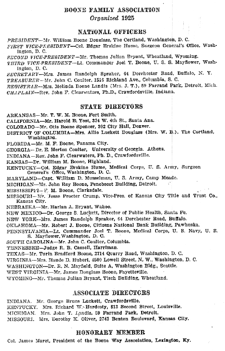 Executive V. P. & Treasurer George E. Merrifield V. P. Higbee Co, Cleveland, Ohio Registrar and Life Historian Mrs. James Randolph Spraker 64 Dorchester Road, Buffalo, N. Y. Chaplain Rev. Canon Hiram K. Douglass 608 Woodlawn Street, Memphis, Tenn. Secretary Miss Ida Jane Ayres Washington, D. C. Publisher Lew M. O'Bannon Publishing Co. Corydon, Indiana Publications Boone Bulletin American Pioneer Records |