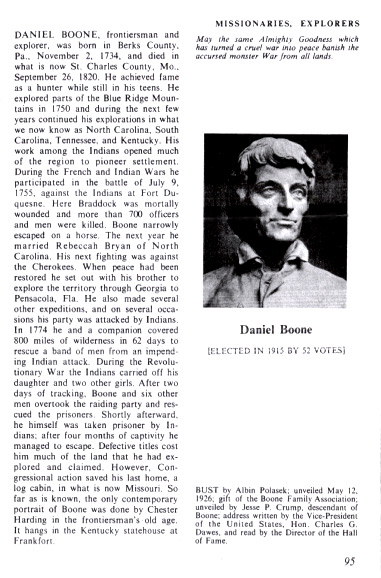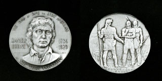 The BFA was active in promoting projects related to the Boone family, including the placement of a mural of Daniel Boone in the U. S. Capitol, the establishment of Boone sites in Kentucky such as Fort Boonesborough, the election of Daniel Boone into the Hall of Fame at New York University, and the minting of a Daniel Boone commemorative half dollar. See a copy of the page about Daniel Boone from a publication of the Hall of Fame, which shows the bust of Boone done by sculptor Albin Polasek. The image below shows the medallion created for the Hall of Fame by C. Jennewein. Douglass and others in the BFA were also very interested in tracing their lineages back to English or European royalty, especially the De Bohuns.