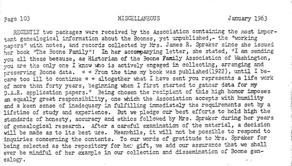 In January of 1963 the association announced that Mrs. Spraker had given it her unpublished notes, letters, and research materials that she'd collected since the 1922 publication of her book The Boone Family. She gave them to the association because she said they were the only organization "actively engaged in collecting, arranging and preserving Boone data." She wanted to make sure that her work would be preserved and disseminated.