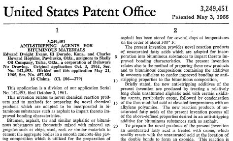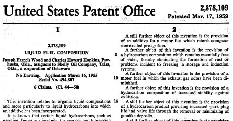 S 2,878,109 Liquid Fuel Composition (17 Mar 1959, Skelly Oil Co.)** This was the patent for the Keotane gasoline additive. Keotane was an additive Dad discovered that helped clean the engine and fuel system, improved gas mileage, and generally helped the car run better. He was especially proud of this patent and his work on Keotane. Dad told me that he was sent to East Texas by Skelly once to help with a problem they were having at their refinery there. He said he saw a billboard along the road with this message Thank You Howard "Hoppy" Hopkins For Inventing KeotaneHe was very proud of that recognition. |