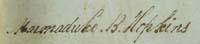 I was fortunate to be contacted by a descendant of Marmaduke Burr Hopkins, who had in her possession the Bible records of that family. The following is a transcription of those records, which show that Marmaduke Burr Hopkins was the son of Isaac and Mary Hopkins. At the right is Marmaduke Burr Hopkins' signature, which was on the flyleaf of this Bible.