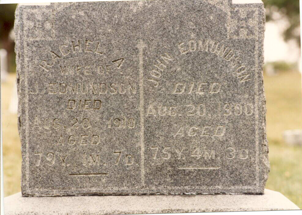 RACHEL A. WIFE OF J. EDMUNDSON DIED AUG 20, 1910 AGED 79Y. 1M. 7D. view monument |