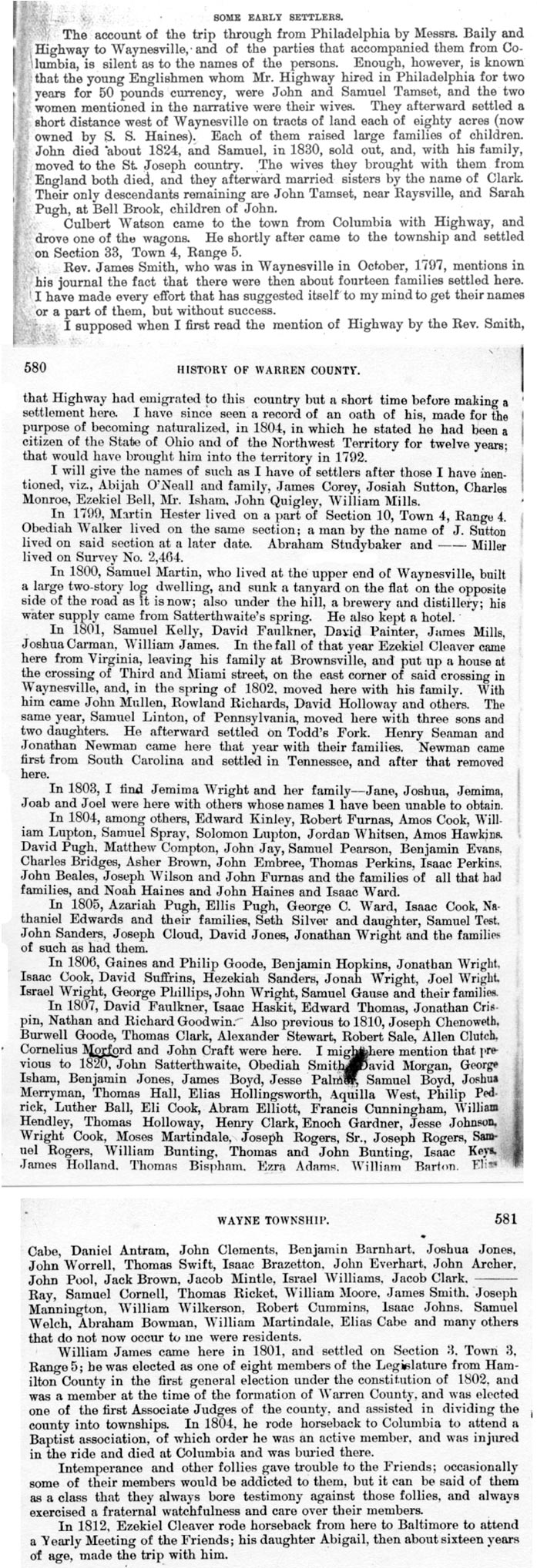 I found several interesting pages about early settlers in Warren County on other sites. Several are located on the Mary L. Cook Library Ohioana Room site. You might look at the Quaker Genealogy in Southwest Ohio blog and the Waynesville, Ohio: Connections with the Past blog. Look especially at the Waynesville Timeline on that blog. There ued to a complete transcription of The History of Warren County, Ohio on the Warren County GenWeb site. Unfortunately, that site is no longer active. However, it is available at the Internet Archive at this address: https://archive.org/details/oh-warren-1882-beers/page/n9.